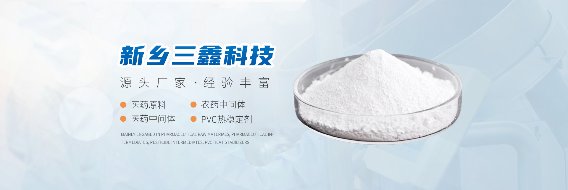 新鄉(xiāng)市三鑫科技有限公司主要從事醫(yī)藥原料、醫(yī)藥中間體、農(nóng)藥中間體、PVC熱穩(wěn)定劑、精細化學品和有機中間體。